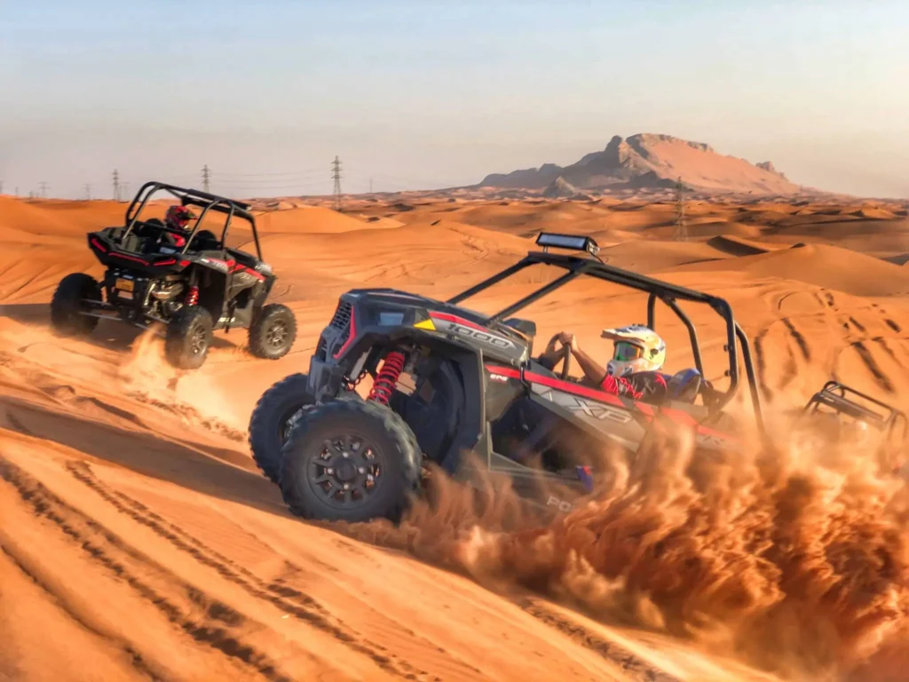 Two off-road vehicles exploring the UAE desert! Book your desert safari now and enjoy the thrilling experience! #DesertSafari #UAE #Dubai #DesertAdventures